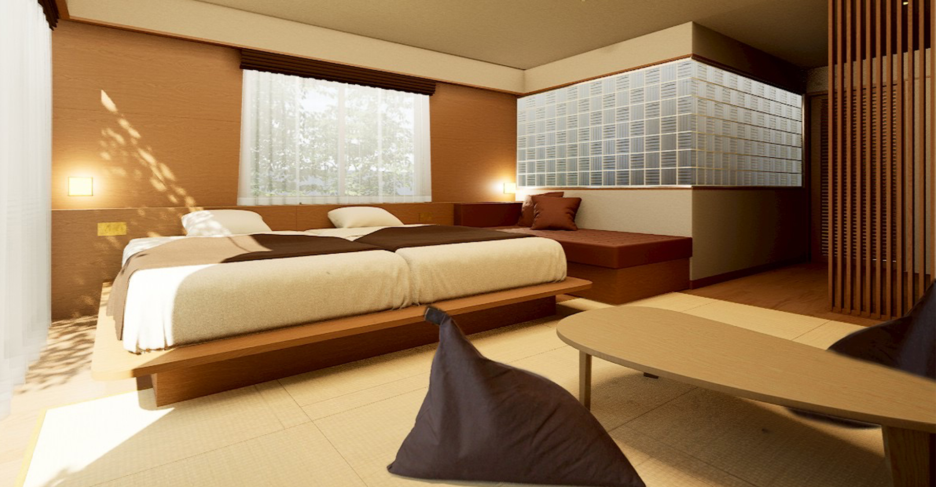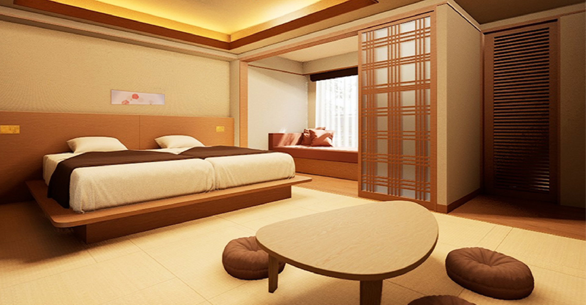 和室のくつろぎとベッドの快適さ、両方の良さを併せ持つ和風ツインルームです。