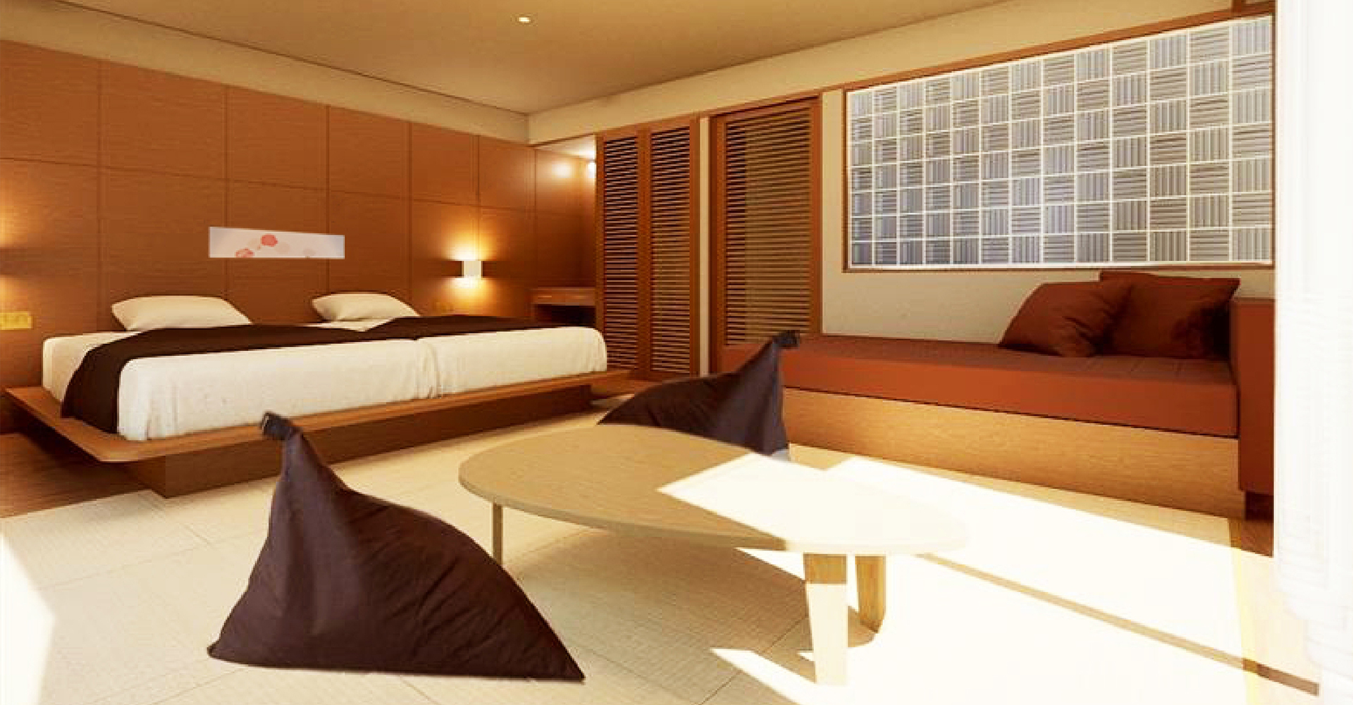 42㎡以上のゆとりある広さと琉球畳の落ち着いた空間が魅力です。バスタブ付きのゆったりとしたバスルームも嬉しいポイント。リニューアルで羽衣の一部客室にソファベッド1台を新設し、お布団と組み合わせて最大4名までご利用いただけます。
